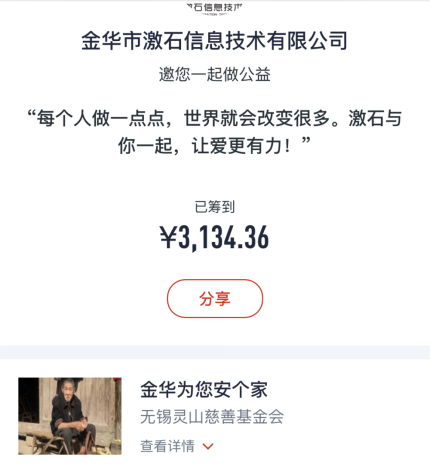 金華市愛一起公益協(xié)會在2016年4月份由11位發(fā)起人注冊登記,也是金華市2016年以來***家直接注冊登記的公益社會組織,協(xié)會一直致力于農(nóng)村孤寡老人的關愛項目,今年的9月9日騰訊公益日,金華愛一起協(xié)會再一次發(fā)起“金華為您安個家”項目的捐款,金華市激石信息技術(shù)有限公司,助力項目的捐款行動,***時間進行項目的的號召與呼吁,螢火蟲愛心社捐出3000元,有一些小伙伴另外又單獨進行了愛心支持。